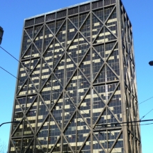 The distinctive X braces supporting this tall black skyscraper were a first - a new approach that Skidmore, Owings & Merrill reprised a few years later on the Hancock Tower in Chicago.