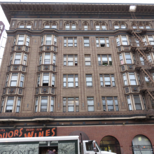 The Hotel Hartland (once known as the Hotel Gartland) is a handsome 3-part vertical composition with lovely brickwork and an imposing projecting cornice. It features four-story bay windows, spandrel panels, and arched windows on the top floor.